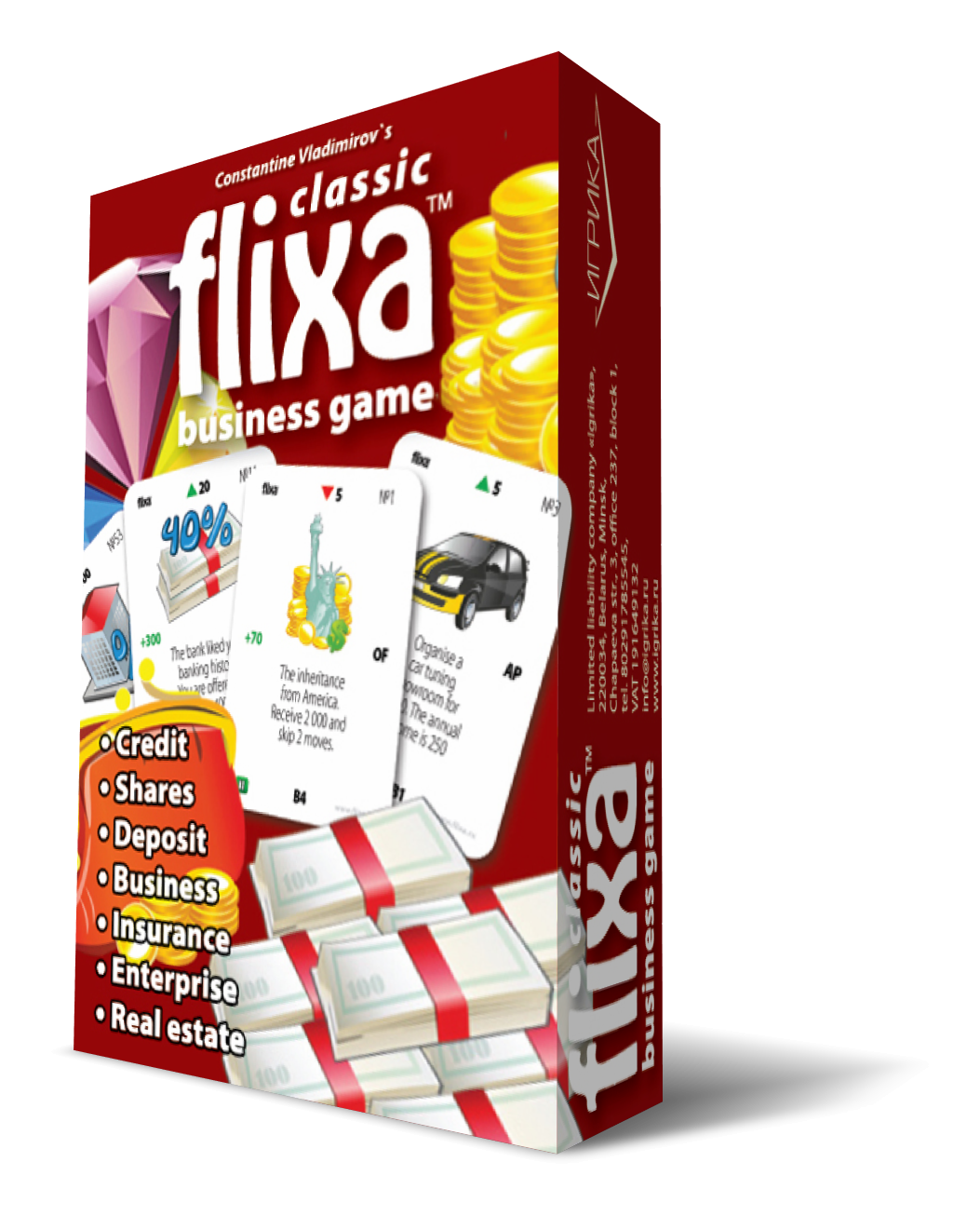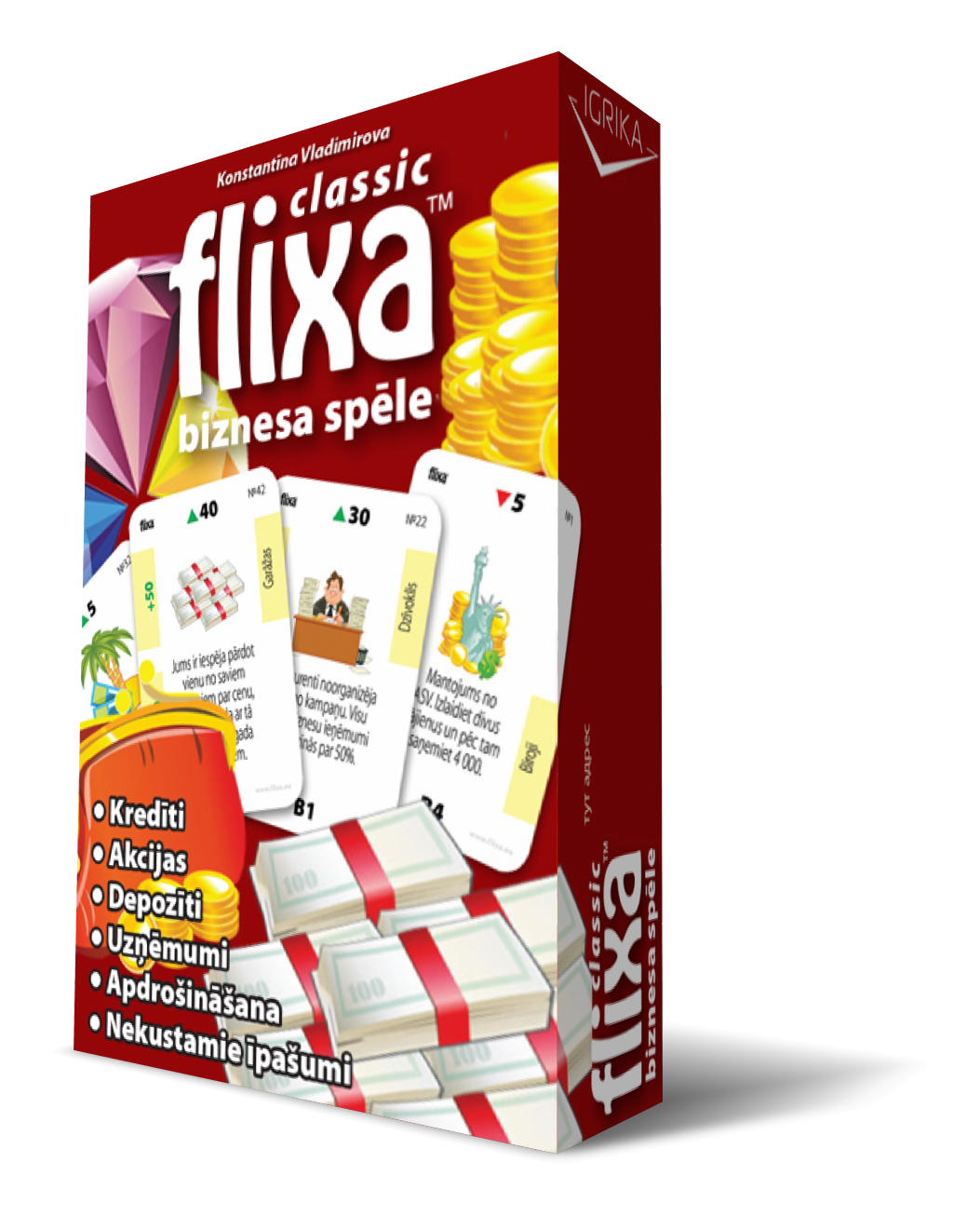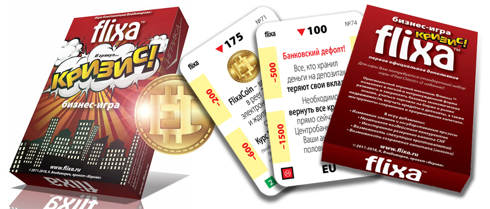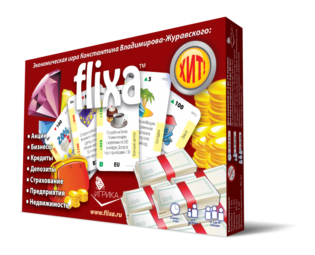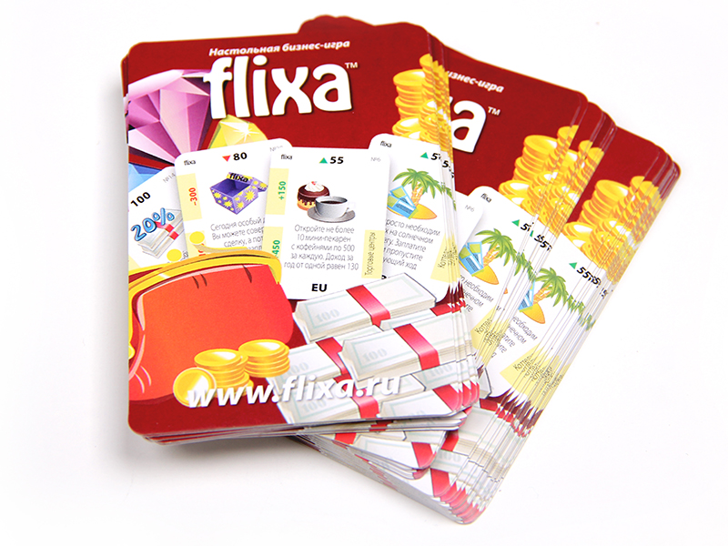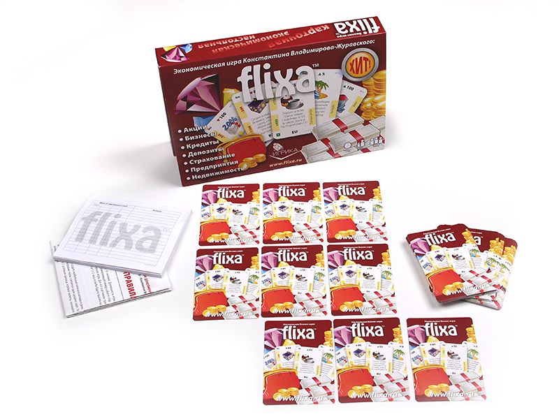 Апісанне гульні: "FLIXA" выканана ў выглядзе картачнай настольнай гульні і не патрабуе дадатковых аксесуараў (фішкі, кубікі, гульнявое поле). У гульні ёсць чатыры віды каштоўных папер: B1, B2, B3, B4 і EU і 6 відаў нерухомасці: зямля, гаражы, кватэры, офісы, катэджы і гандлёвыя цэнтры, якія прыносяць даход (рэнтавая нерухомасць).