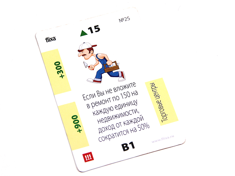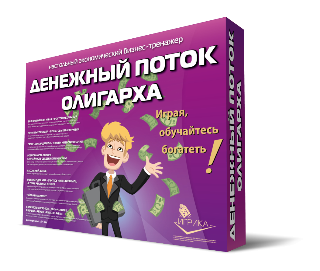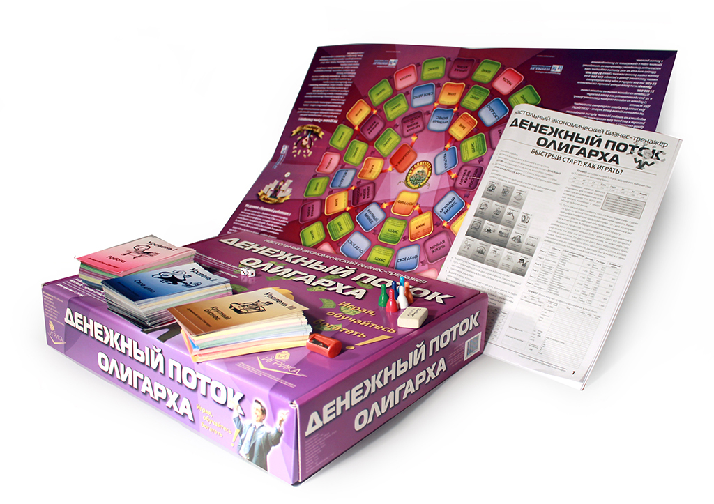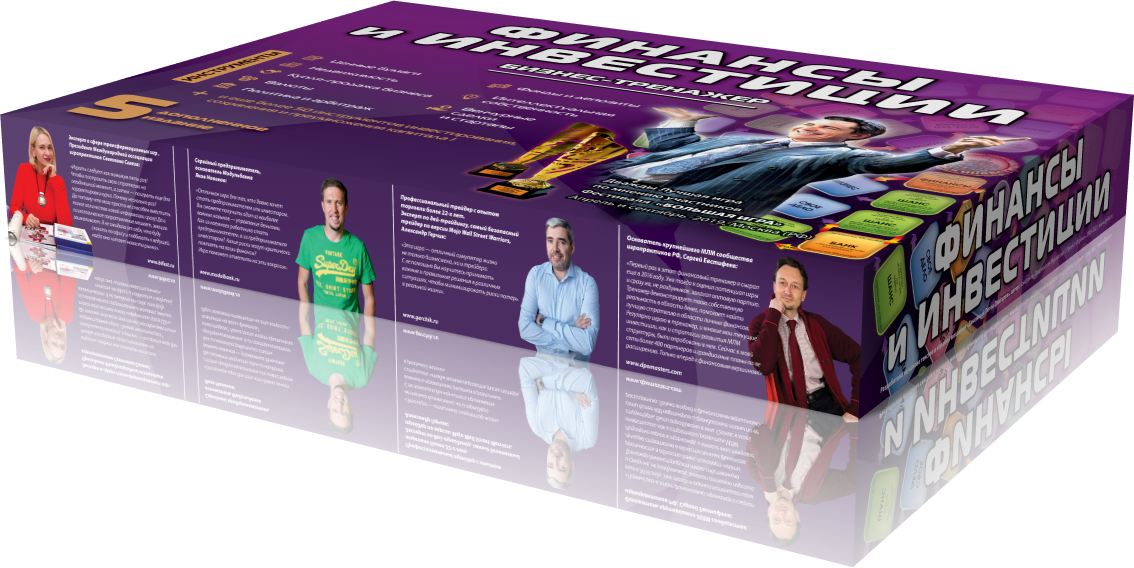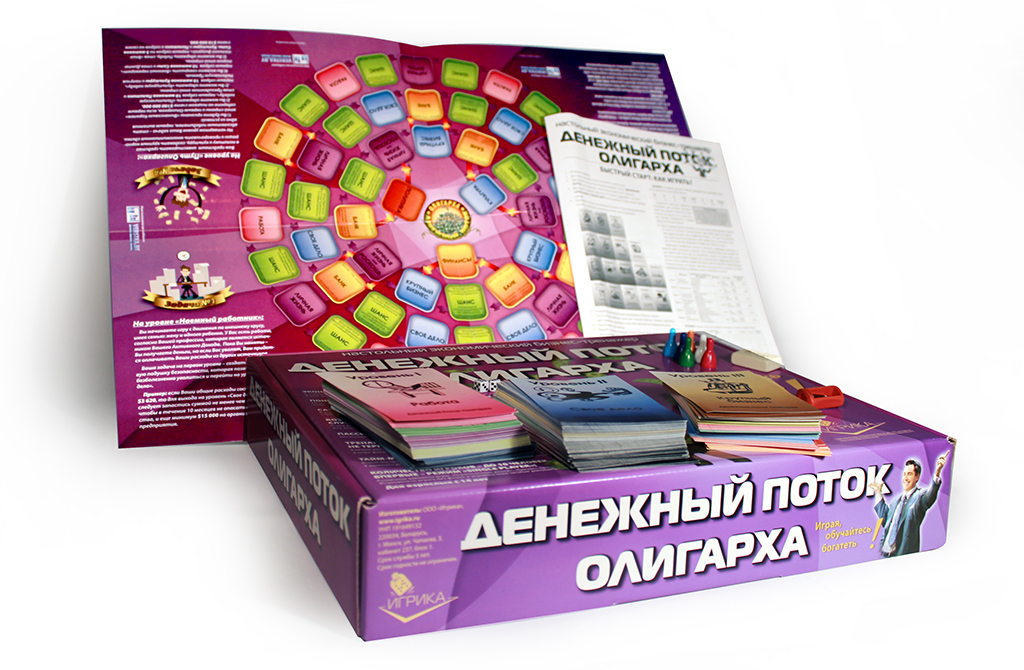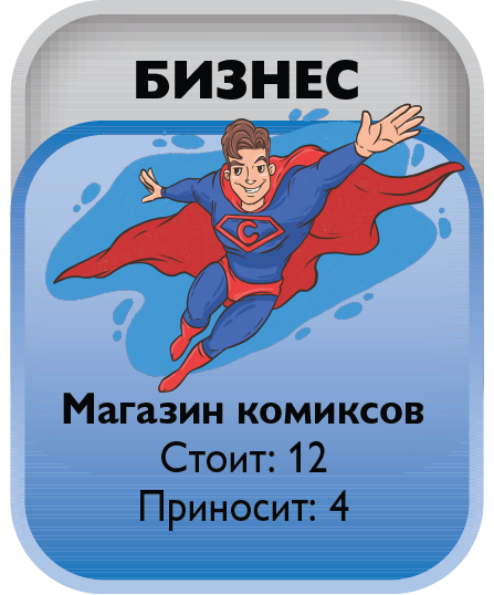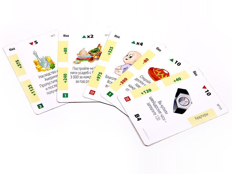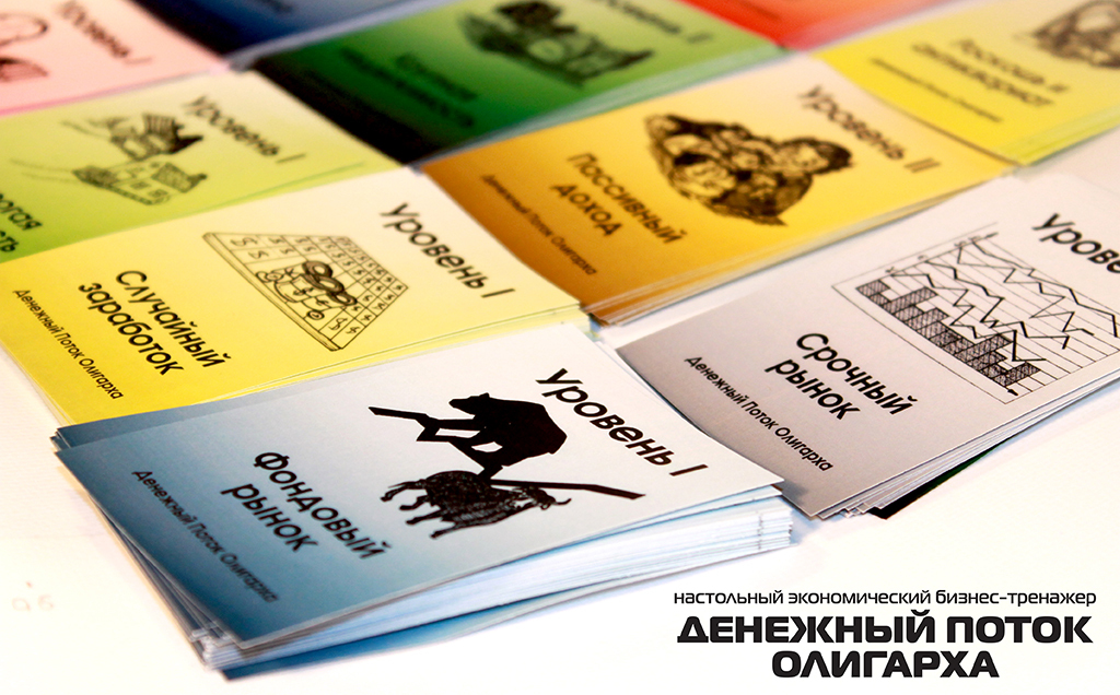 The game includes 4 types of unprofitable «penny» shares - B1, B2, B3, B4 and EU bonds, yielding a small income. The real estate market is represented by six types of assets from land to shopping centers. The prices for these assets are constantly changing in the game as the game cards are opened on the table, which makes it possible to earn not only on a rental payment, but also on the market price spread. There is an opportunity to create and develop your business from one stand to the whole network and sell it to an angel investor in the game. The game lasts from 3 to 10 game years. One game year is one deal of game cards on a table. After the cards are opened, the year ends. At the end of the year, the players calculate the profit from assets and increase capital. The winner is the one who formed the maximal capital.