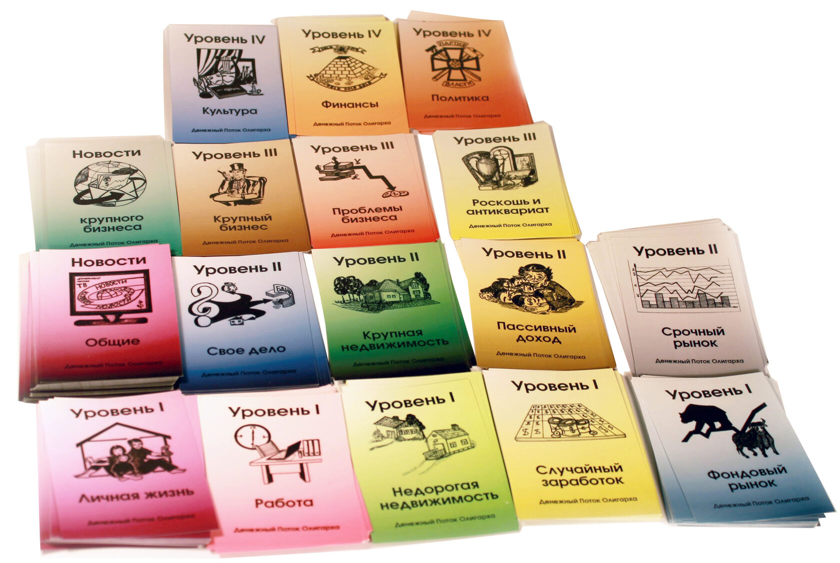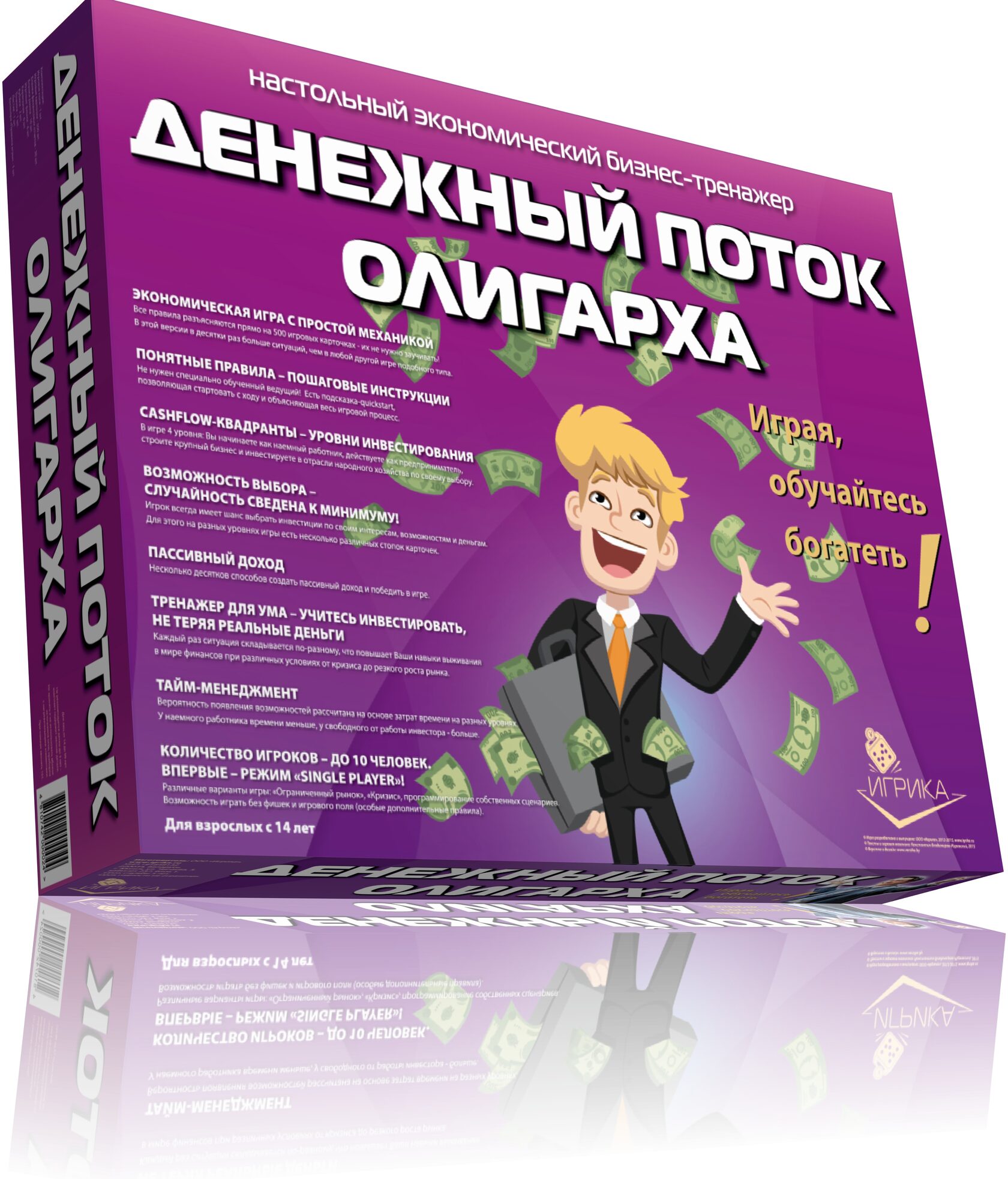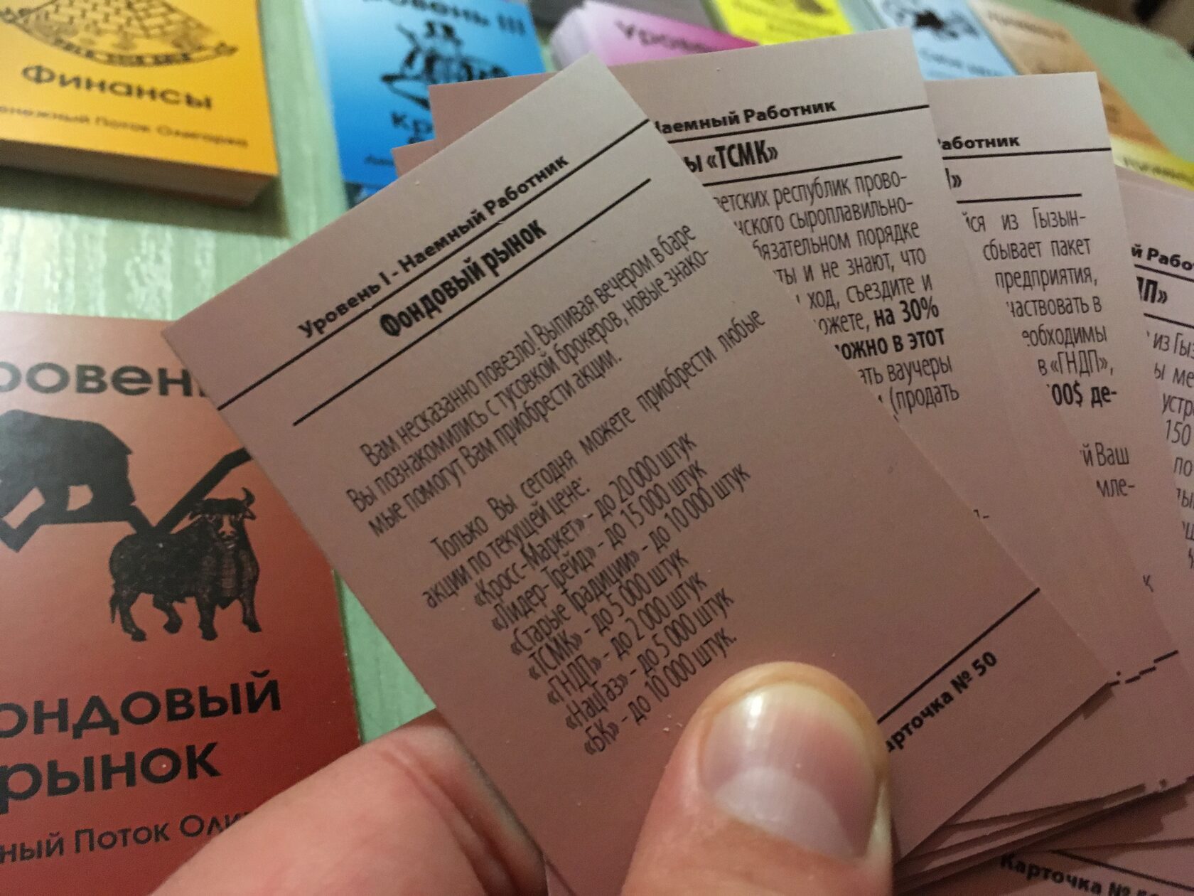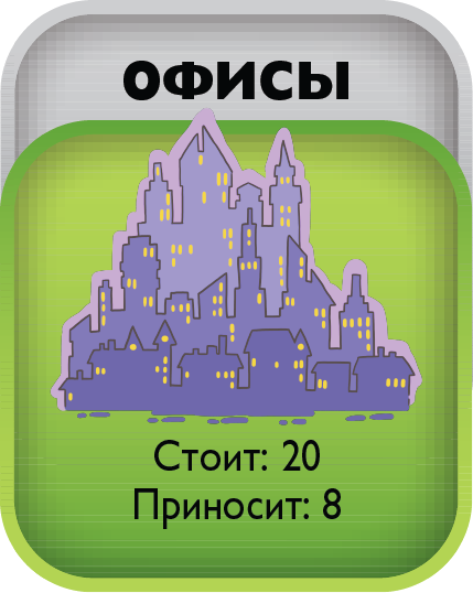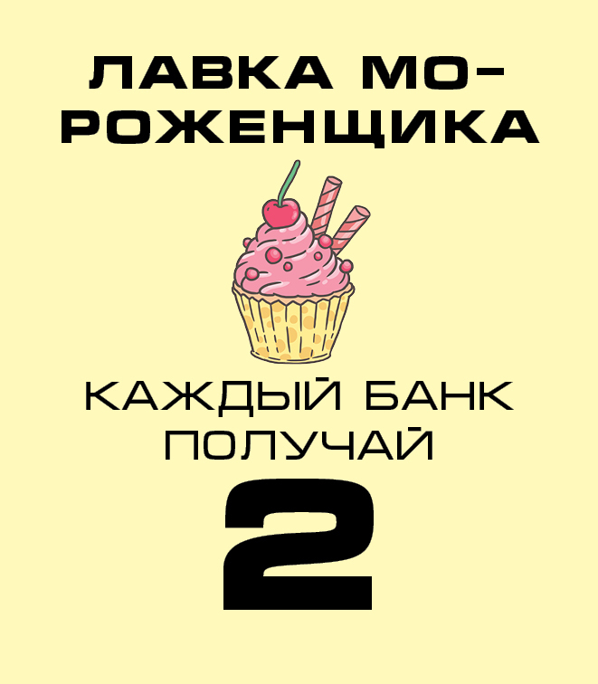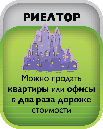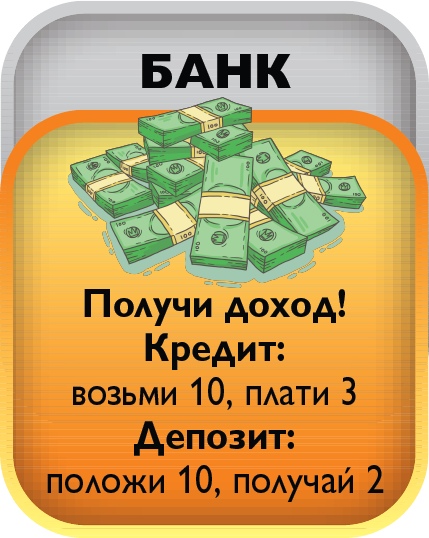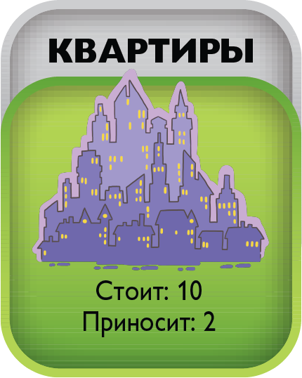 The game includes 4 types of unprofitable «penny» shares - B1, B2, B3, B4 and EU bonds, yielding a small income. The real estate market is represented by six types of assets from land to shopping centers. The prices for these assets are constantly changing in the game as the game cards are opened on the table, which makes it possible to earn not only on a rental payment, but also on the market price spread. There is an opportunity to create and develop your business from one stand to the whole network and sell it to an angel investor in the game. The game lasts from 3 to 10 game years. One game year is one deal of game cards on a table. After the cards are opened, the year ends. At the end of the year, the players calculate the profit from assets and increase capital. The winner is the one who formed the maximal capital.