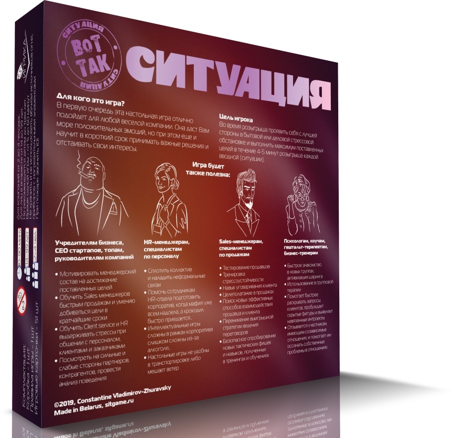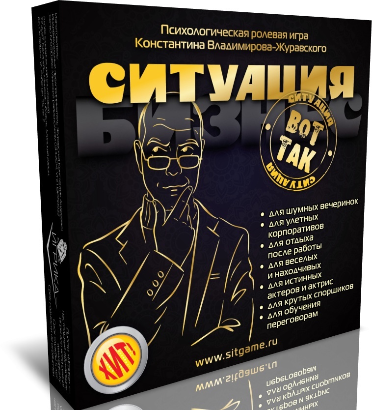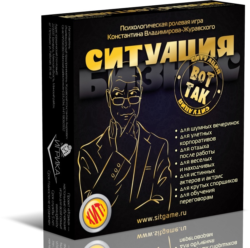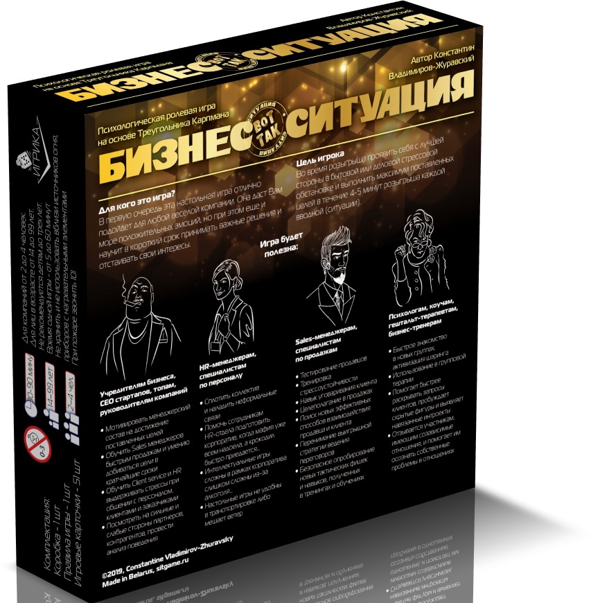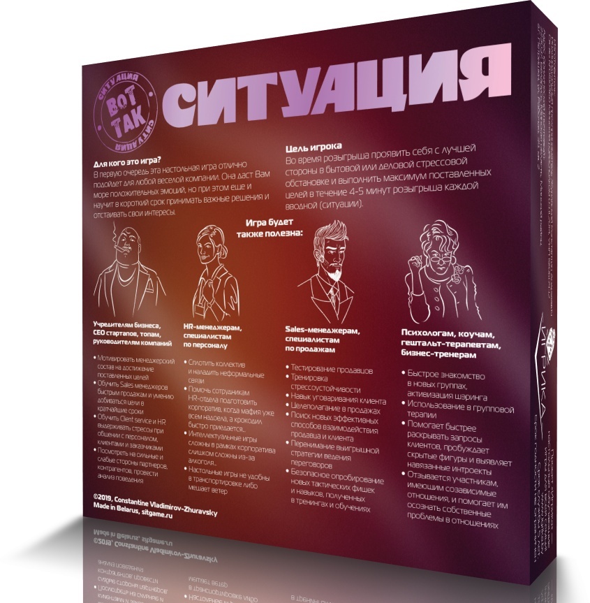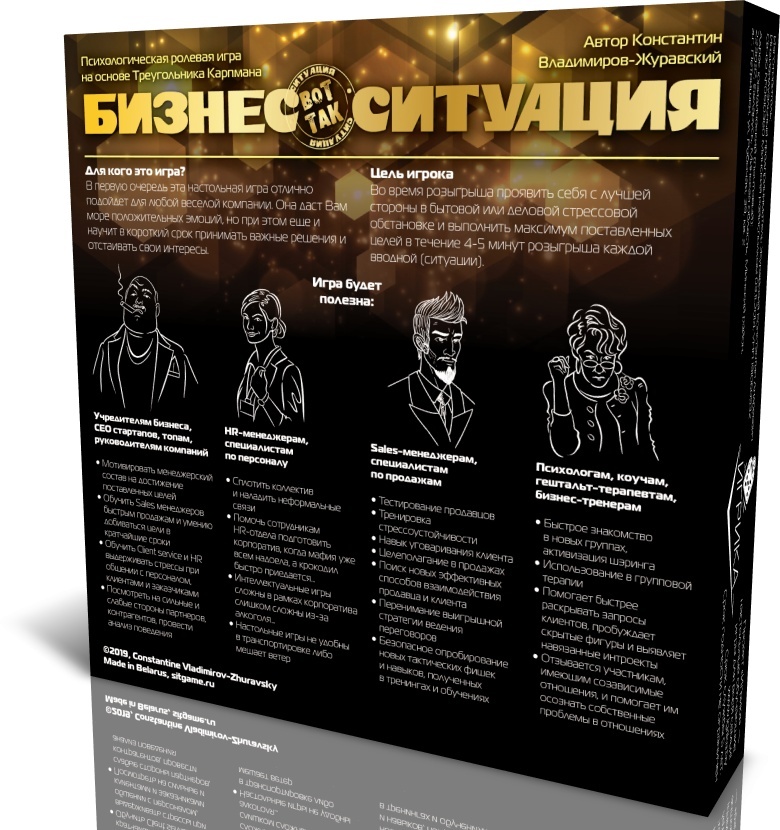 Псіхалагічная картачная ролевая гульня на трэніроўку навыкаў перамоваў. Выпускаецца ў дзвюх частках. Перад Вамі - "Бізнес". Асноўная мэта гульні: праявіць сябе з лепшага боку ў стрэсавай дзелавой сітуацыі і выканаць максімум пастаўленых мэт на працягу 4-5 хвілін розыгрышу ўступнай (сітуацыі). Простая, зручная, цікавая! Мэта гульца: праявіць сябе з лепшага боку ў бытавой стрэсавай сітуацыі і выканаць максімум пастаўленых мэт на працягу 4-5 хвілін розыгрышу кожнай уступнай (сітуацыі).
