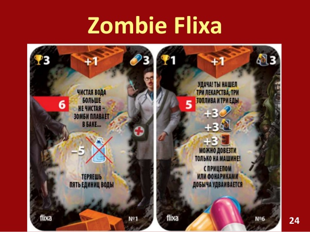 "Zombie Flixa" - унікальная і простая гульня. Вы вывучыце правілы і зможаце гуляць ужо праз 15 хвілін. Стандартная партыя доўжыцца ад 30 хвілін да 2 гадзін і складаецца з 5/6 раздач карт. Лічыцца, што за гэты час праходзіць 5-6 месяцаў у постапакаліптычным свеце. Працэс гульні вельмі просты: карткі з заданнямі, размяшчаюцца па пэўных правілах, фармуючы ўнікальнае агульнае гульнявое поле пры кожнай новай раздачы. Сітуацыя не паўторыцца НІКОЛІ! Вы не зможаце абвінаваціць іншага гульца ў шанцаванні - Вы самі фармуеце рэальнасць раскладваючы карткі, бо Вам жадаецца і Вы можаце ўплываць на магчымасці ў гульні. Падчас гульні ўдзельнікі па чарзе адчыняюць карты і выконваюць заданні. Ім даводзіцца абараняць лагер і шукаць харчаванне, абараняць тэрыторыю і будаваць плот вакол стартавай лакацыі, гандляваць з іншымі групамі і ратаваць людзей.