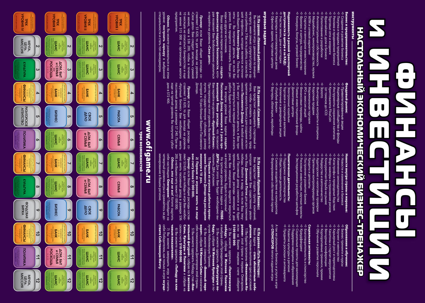 Для пераходу на кожны вышэйстаячы ўзровень удзельніку гульні патрабуецца выканаць пэўныя ўмовы, якія з кожным узроўнем усё цяжэй. Каб перамагчы, гульцу неабходна сабраць пэўную колькасць рэсурсаў. Для гэтага яму неабходна выбраць пэўную стратэгію, распрацаваць план дасягнення перамогі, паставіць сабе мэты і дакладна прытрымліваючыся плана рухацца да іх дасягнення. Ажыццяўляючы па чарзе хады ў гульні, удзельнікі атрымліваюць уступныя, згодна з якімі яны кіруюць сваімі даходамі і расходамі, а таксама могуць ажыццяўляць здзелкі куплі-продажу нерухомасці і актываў, гандляваць на валютна-фондавай біржы, а таксама інвеставаць уласныя сродкі ў розныя фінансавыя інструменты.