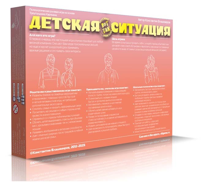 Псіхалагічная картачная ролевая гульня на трэніроўку навыкаў перамоваў. Выпускаецца ў дзвюх частках. Перад Вамі - "Бытавая". Асноўная мэта гульні: праявіць сябе з лепшага боку ў стрэсавай бытавой сітуацыі і выканаць максімум пастаўленых мэт на працягу 4-5 хвілін розыгрышу ўступнай (сітуацыі). Простая, зручная, цікавая!