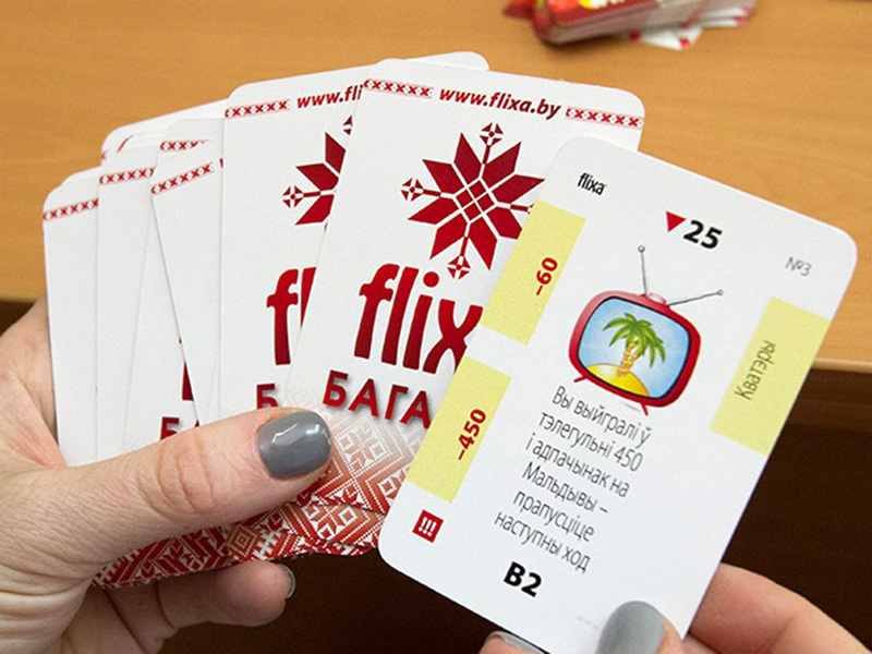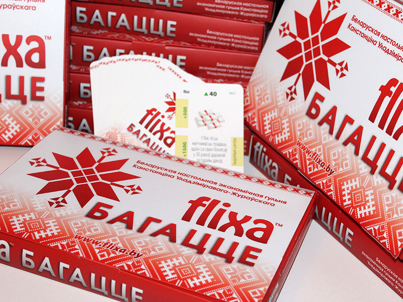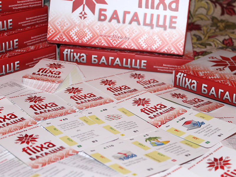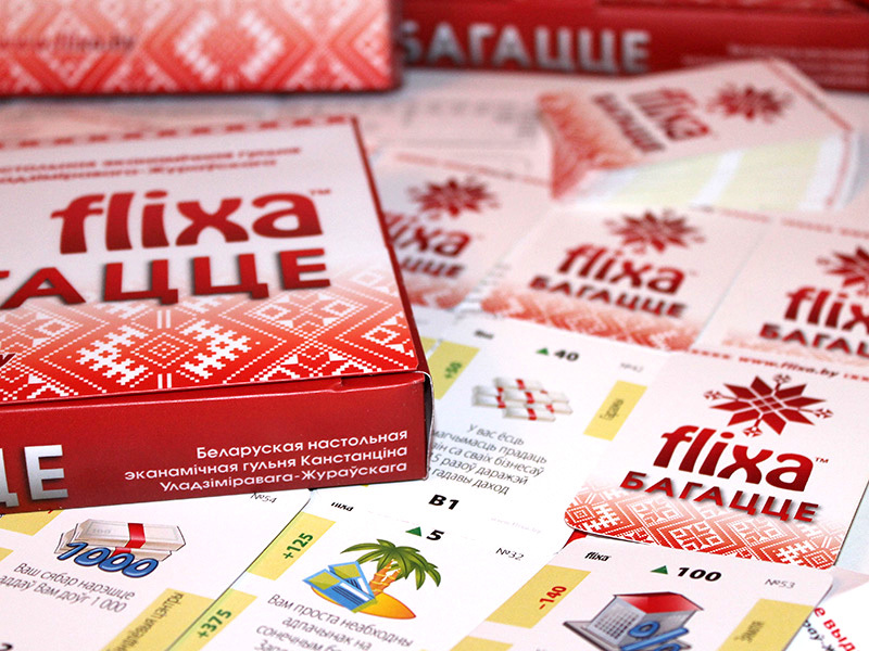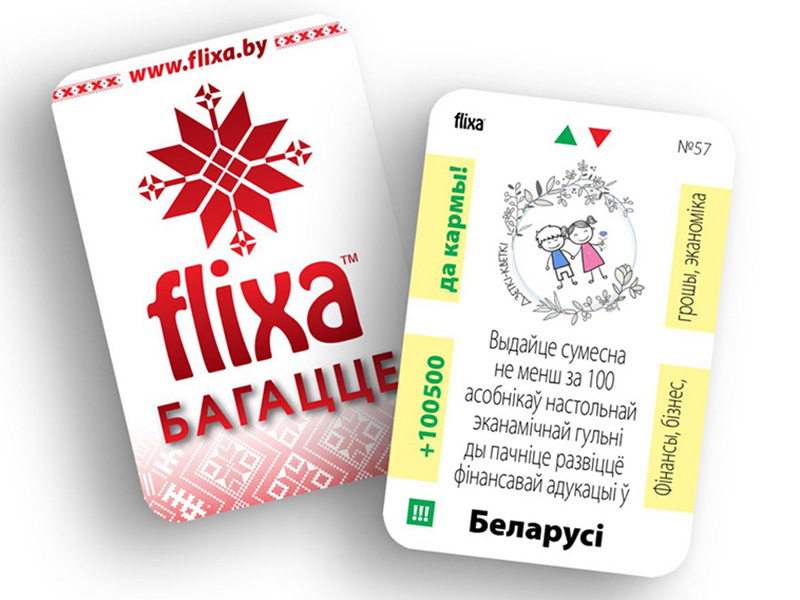 "FLIXA" выканана ў выглядзе картачнай настольнай гульні, кампактная, не патрабуе дадатковых аксесуараў (фішкі, кубікі, гульнявое поле). Гэта гульня выкарыстоўваецца ў адукацыйных праграмах для дзяцей і дарослых, рэкамендавана і адобрана для павышэння фінансавай граматнасці насельніцтва.