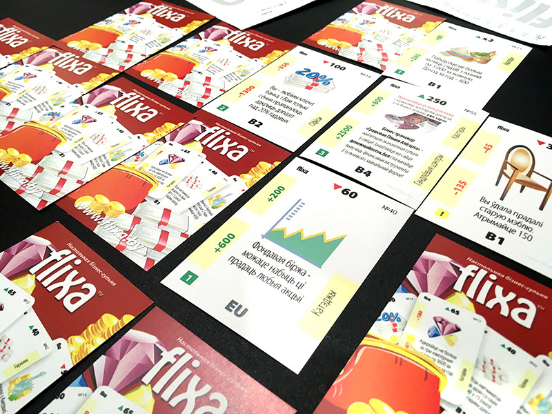 Апісанне гульні: "FLIXA" выканана ў выглядзе картачнай настольнай гульні і не патрабуе дадатковых аксесуараў (фішкі, кубікі, гульнявое поле). У гульні ёсць чатыры віды каштоўных папер: B1, B2, B3, B4 і EU і 6 відаў нерухомасці: зямля, гаражы, кватэры, офісы, катэджы і гандлёвыя цэнтры, якія прыносяць даход (рэнтавая нерухомасць).