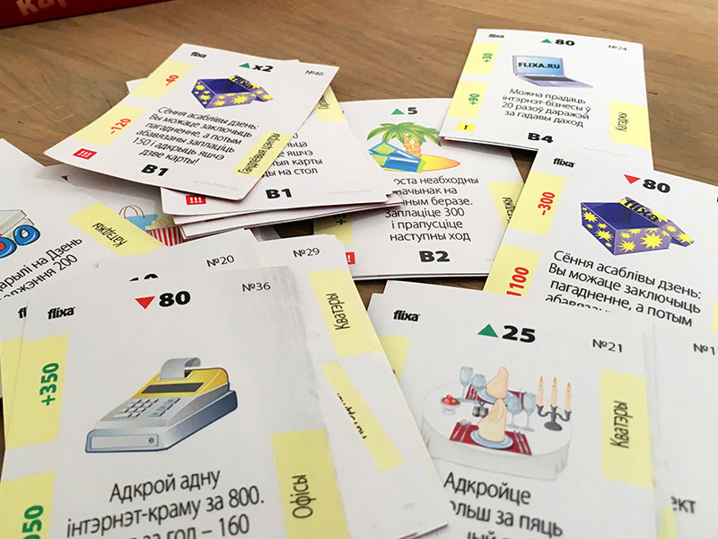 The game includes 4 types of unprofitable «penny» shares - B1, B2, B3, B4 and EU bonds, yielding a small income. The real estate market is represented by six types of assets from land to shopping centers. The prices for these assets are constantly changing in the game as the game cards are opened on the table, which makes it possible to earn not only on a rental payment, but also on the market price spread. There is an opportunity to create and develop your business from one stand to the whole network and sell it to an angel investor in the game. The game lasts from 3 to 10 game years. One game year is one deal of game cards on a table. After the cards are opened, the year ends. At the end of the year, the players calculate the profit from assets and increase capital. The winner is the one who formed the maximal capital.